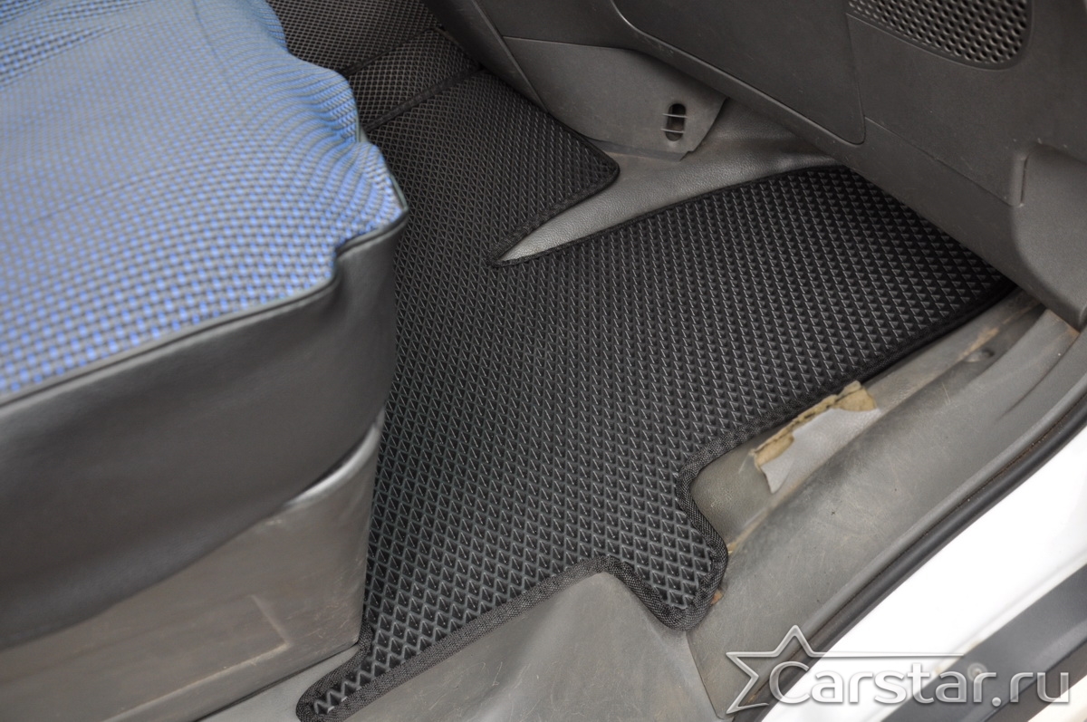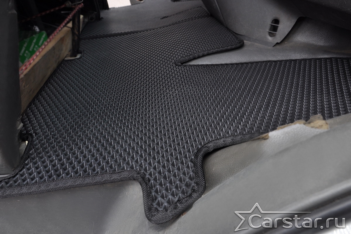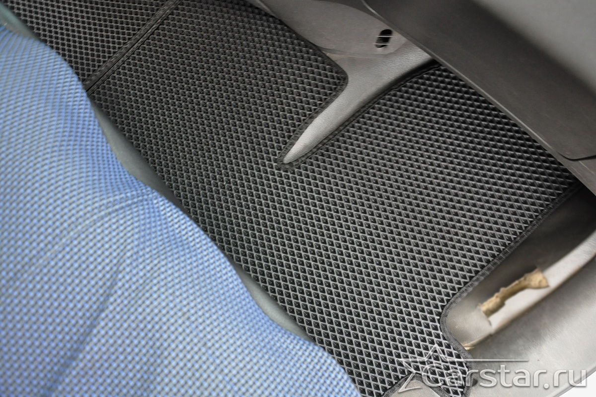 Толщина ковриков EVA составляет 10-12 мм. Глубина ячеек 7-8 мм. Такая толщина ковриков позволяет им служить довольно долго, не протираясь до 3 лет. А благодаря такой глубине ячеек коврик EVA площадью 1 кв.м. способен захватить около 3,5 л жидкости, сохраняя в чистоте вашу обувь и обивку салона.