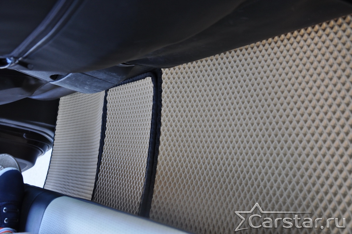 Толщина ковриков EVA составляет 10-12 мм. Глубина ячеек 7-8 мм. Такая толщина ковриков позволяет им служить довольно долго, не протираясь до 3 лет. А благодаря такой глубине ячеек коврик EVA площадью 1 кв.м. способен захватить около 3,5 л жидкости, сохраняя в чистоте вашу обувь и обивку салона.