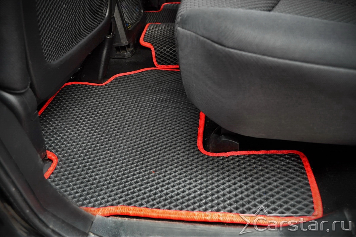 Толщина ковриков EVA составляет 10-12 мм. Глубина ячеек 7-8 мм. Такая толщина ковриков позволяет им служить довольно долго, не протираясь до 3 лет. А благодаря такой глубине ячеек коврик EVA площадью 1 кв.м. способен захватить около 3,5 л жидкости, сохраняя в чистоте вашу обувь и обивку салона.