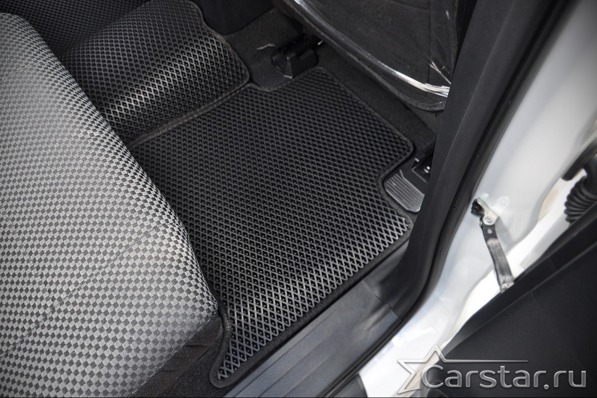 Толщина ковриков EVA составляет 10-12 мм. Глубина ячеек 7-8 мм. Такая толщина ковриков позволяет им служить довольно долго, не протираясь до 3 лет. А благодаря такой глубине ячеек коврик EVA площадью 1 кв.м. способен захватить около 3,5 л жидкости, сохраняя в чистоте вашу обувь и обивку салона.