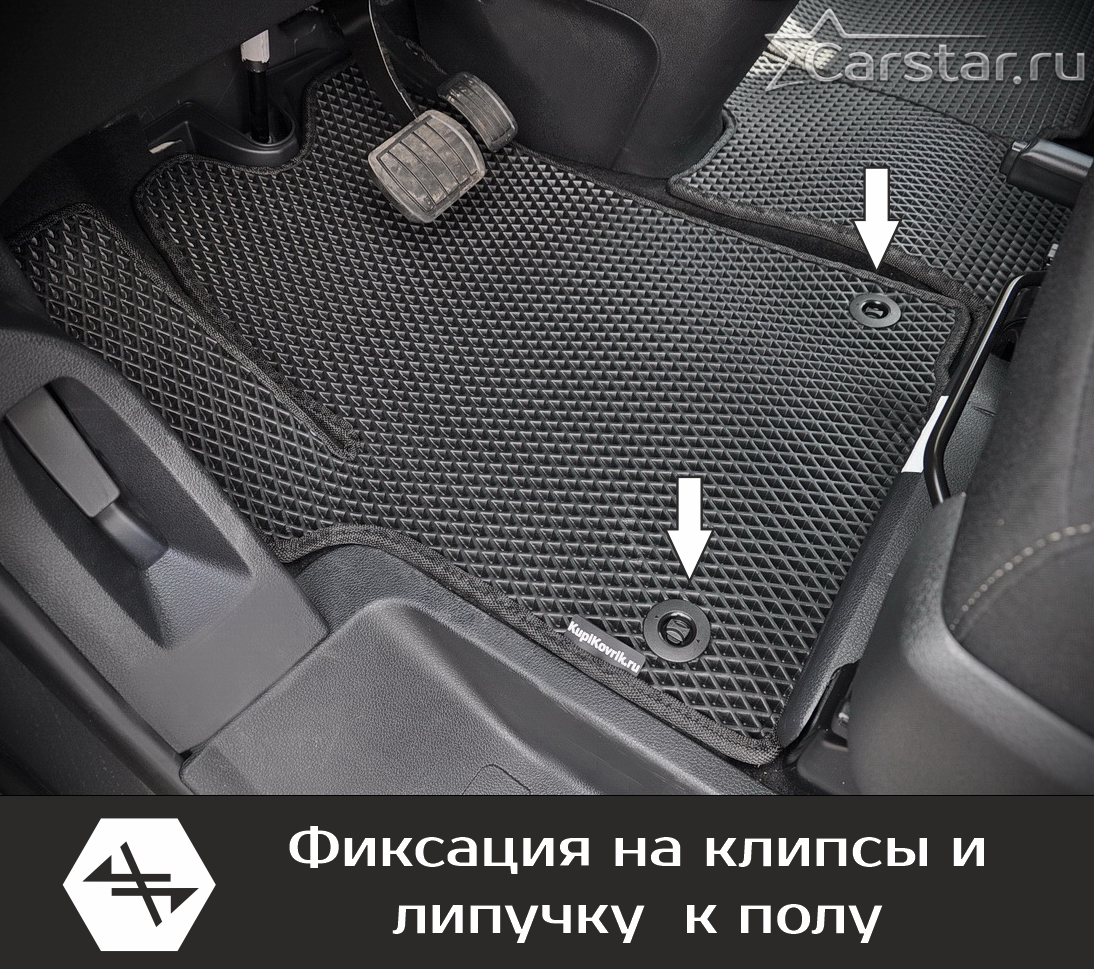 Текстильные коврики надёжно крепятся с помощью оригинальных систем фиксации. Обратная сторона имеет противоскользящее покрытие, что обеспечивает защиту от смещений и безопасность. Максимальное удобство достигается точными лекалами.